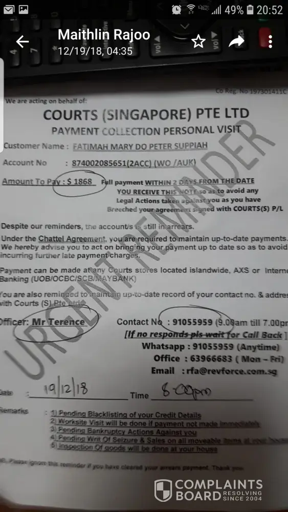Courts Singapore By sending a debt. Collector to the house of a 72 year old lady at 10 pm.