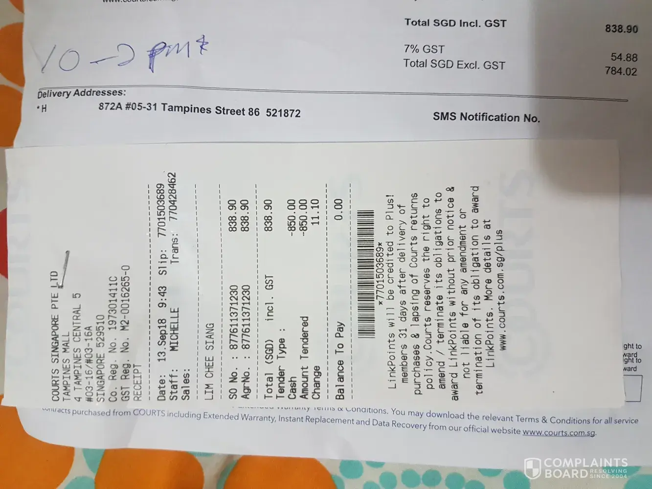 Purchased Bosch Washing machine at Courts warehouse @tampines on 8 oct and delivery scheduled for 14 oct Sunday, 11 am to 2 pm time slot.