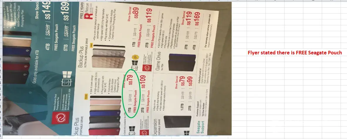 Flyers stated there is free Seagate pouch given for every 1TB Backup Plus Portable Drive at Show Special Price of S$79.