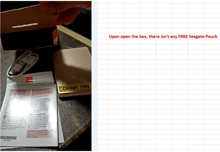I've purchased total 2pcs of 1TB (Gold & Blue) colour from Courts at the show but when I opened up the package box, I could not find any free Seagate Pouch at all...