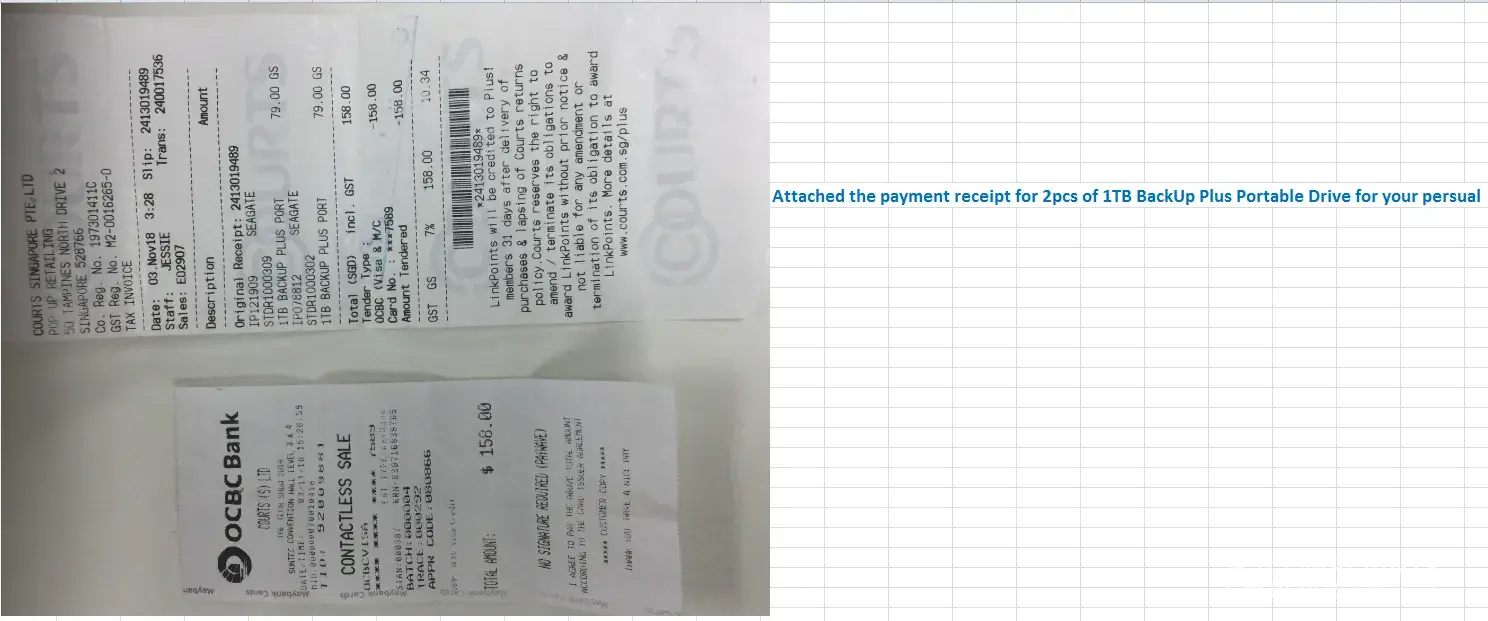 I've attached all the evidence so need your help to investigate & advise if I can go the nearest Courts Store (eg Jurong Point) to collect the "missing" Seagate Pouch from the staff?