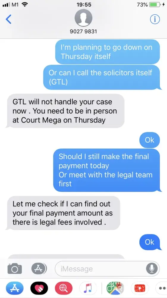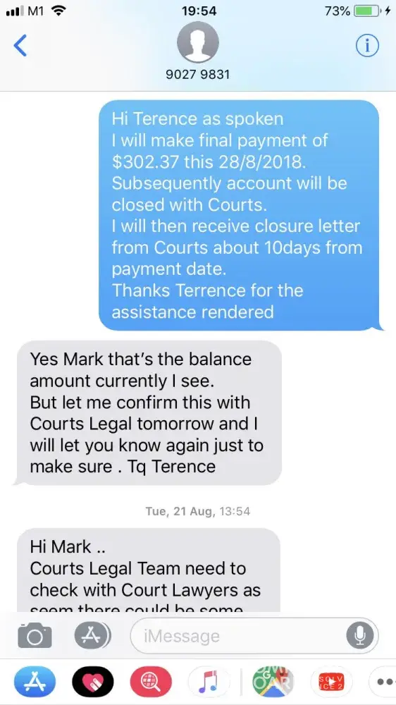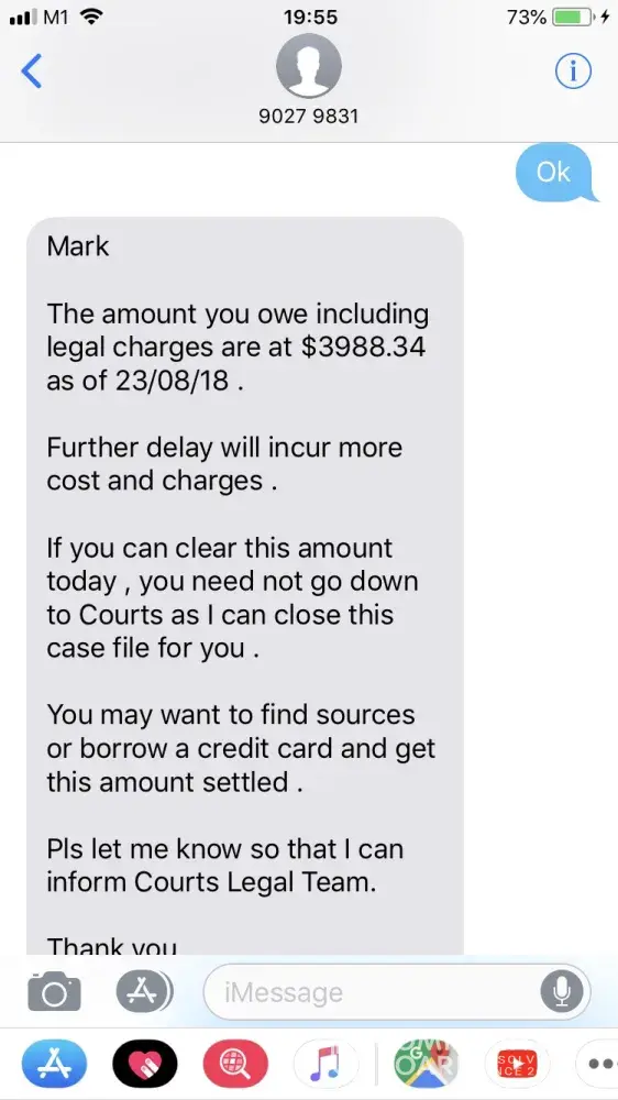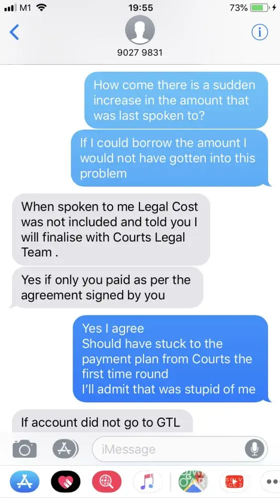I am writing to you imploring for assistance. A little background on my situation; I had purchased some items from Courts in December 2011. My first installment was due on Feb 2017 however in my stupidity and lack of clarity of mind, I had lapsed the payment due to Courts. Subsequently, the account was handed over to GTL (Guan Teck Lim) which was then given to the bailiffs to remove the items from my home; i.e., couch, refrigerator, washing machine, stereo (and some other items I cannot remember). I did ask for the list of items removed from my home as well as the breakdown of the cost of the items that would go to paying for the amount owing to Courts. I was told by GTL that the breakdown of the items as well as the cost and the balance due would be sent to me; till date I have yet to obtain anything. This has been going on for some months now, and every time I called GTL, I am given the runaround. GTL says they have no emails to correspond with and can only do so via calls; so how do I be able to track our conversations? Left with no other choice, I approached Courst via email again and asked for the SOA. They had sent me the SOA albeit by mistake (the officer sent another email to tell me to "forget" about the email). In the SOA dated, for the transaction date 2/8/17, it showed a balance of $1802.37. This is one year ago from today. Based on that I would have paid off all the monies owing to Courts and would be deemed free and clear. However, I received a text message from Revelation Force (i believe) telling me about the monies I owed. At this juncture let me say this, the payment for the month of Aug 2018 was held off so I could get someone to call me. That is when this person contacted me and told me the amount owing was $302.37. He then said he will confirm with Courts again. The next I hear from this person I owe something to the amount of $3500. How is that possible? What have I been paying thus far? I am being harassed both mentally and emotionally. My family life is affected and I feel I am on the verge of a mental breakdown. When I asked this person about the supposed monies owing, all he said was he can't reveal and can only say this is the total amount, however if I were to pay off $3200 in cash (in one time), the account would be closed.
