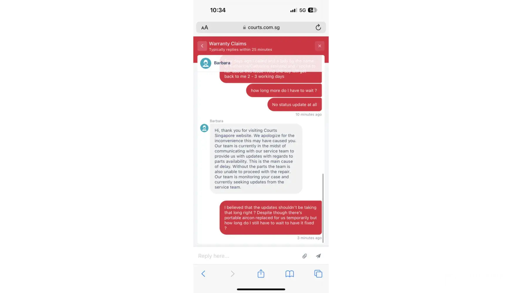 - Went to virtual online assistance ( refer to photos attached ) and 2 days later no one get back , therefore I called customer service again yesterday on 07 May 2023 and the lady by the name of Hiaty(sorry if I spelled her name wrongly) told me that parts may even take months to arrive and there is no fixed date she is able to give on the arrival status update as the relevant team has yet to get back to them and our case is still pending