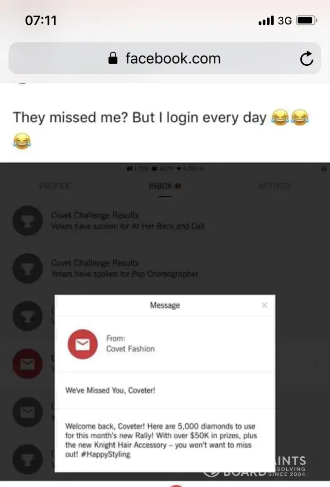I am going to start this message declaring thay Covet Fashion support is the worst support I have ever received from any game I play. They have a Help tab in the game that allows to send a message or complaint to them but the messages sent simply disappear out of nowhere. When the message does not disappear, they take over a month to send you a reply that does not clarify anything let alone providing solutions.