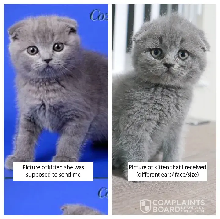 • sent me fake pictures and videos of my kitten (She has now taken down the post with the kitten she told me she sold but I took screenshots of everything *picture comparison attached (Her picture on the left, the kitten I received on the right)