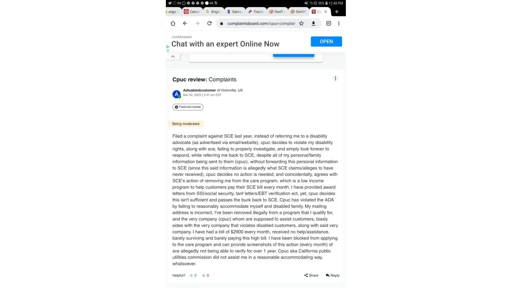 Filed a complaint against SCE last year, instead of referring me to a disability advocate (as advertised via email/website), cpuc decides to violate my disability rights, along with sce, failing to properly investigate, and simply took forever to respond, while referring me back to SCE, despite all of my personal/family information being sent to them (cpuc), without forwarding this personal information to SCE (since this said information is allegedly what SCE claims/alleges to have never received), cpuc decides no action is needed, and coincidentally, agrees with SCE's action of removing me from the care program, which is a low income program to help customers pay their SCE bill every month. I have provided award letters from SSI/social security, tanf letters/EBT verification ect, yet, cpuc decides this isn't sufficient and passes the buck back to SCE. Cpuc has violated the ADA by failing to reasonably accommodate myself and disabled family. My mailing address is incorrect, I've been removed illegally from a program that I qualify for, and the very company (cpuc) whom are supposed to assist customers, biasly sides with the very company that violates disabled customers, along with said very company. I have had a bill of $2900 every month, received no help/assistance, barely surviving and barely paying this high bill. I have been blocked from applying to the care program and can provide screenshots of this action (every month) of sce allegedly not being able to verify for over 1 year. Cpuc aka California public utilities commission did not assist me in a reasonable accommodating way, whatsoever.