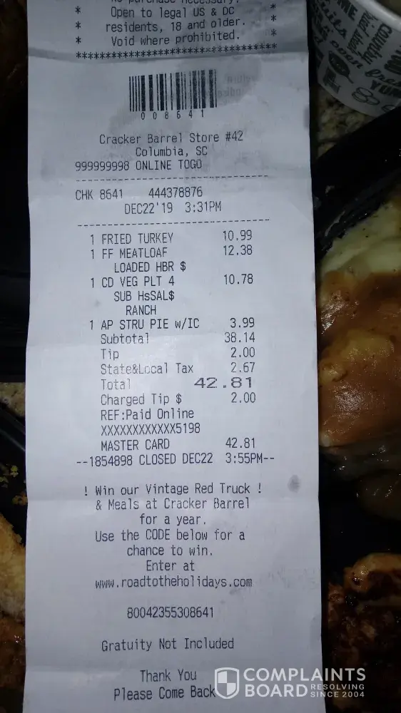 Firstly - I am a long-time fan of Craker Barrel! I also want you to know exactly why I am very dissappointed. Placed online order on Dec 22-2019 at 1513 hrs for pickup at 1600 at store #42- Columbia, S.C. Arrived at store at 1555 and was soon told (turkey dinner was not available, no phone call)! I said I would take grilled chicken instead. At 1620 hrs I was contemplating asking for refund and asked to see a manager and I spoke with a very busy young man that was unaware I was waiting on my food, he took my receipt and dissappeared into the kitchen. My food arrived at 1630 hrs by another employee who had no idea what was going on. Upon unpacking and checking our food order I was even more dissappointed at the inaccuracy to fill our order. I am listing the accuracy issues in the order of our receipt, photos attached below. Fried Turkey Dinner (not available). Meatloaf dinner (meatloaf charred and no mac and cheese pics attached). We ordered bisquits and got nothing. Vegetable plate (house salad with ranch on side, we got nothing).in pictures you will see my receipt and food photos at least what we got. Normally you guys do a great job and we have always been happy - tonight we are at the polar opposite of that.in total our check was $42.81, I just dont feel like this is somthing normal to your business and I wanted someone to know what happened.