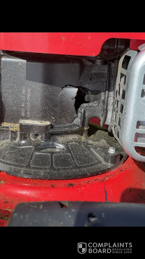 On August 21, 2021, I was cutting my yard with the above push mower when suddenly it started making a rattle noise and seconds later I seen metal shooting out of the side. Luckily my kids or wife was not outside and no vehicles or house was damaged. I picked up several pieces of metal out of my yard but believe there is more that I could not see. I purchased this lawn mower in April of this year and used 10 times or less. I am pretty disappointed with this product. See attached photos. The lawnmower will no longer start and makes a loud rattling noise when trying. This could have ended very badly