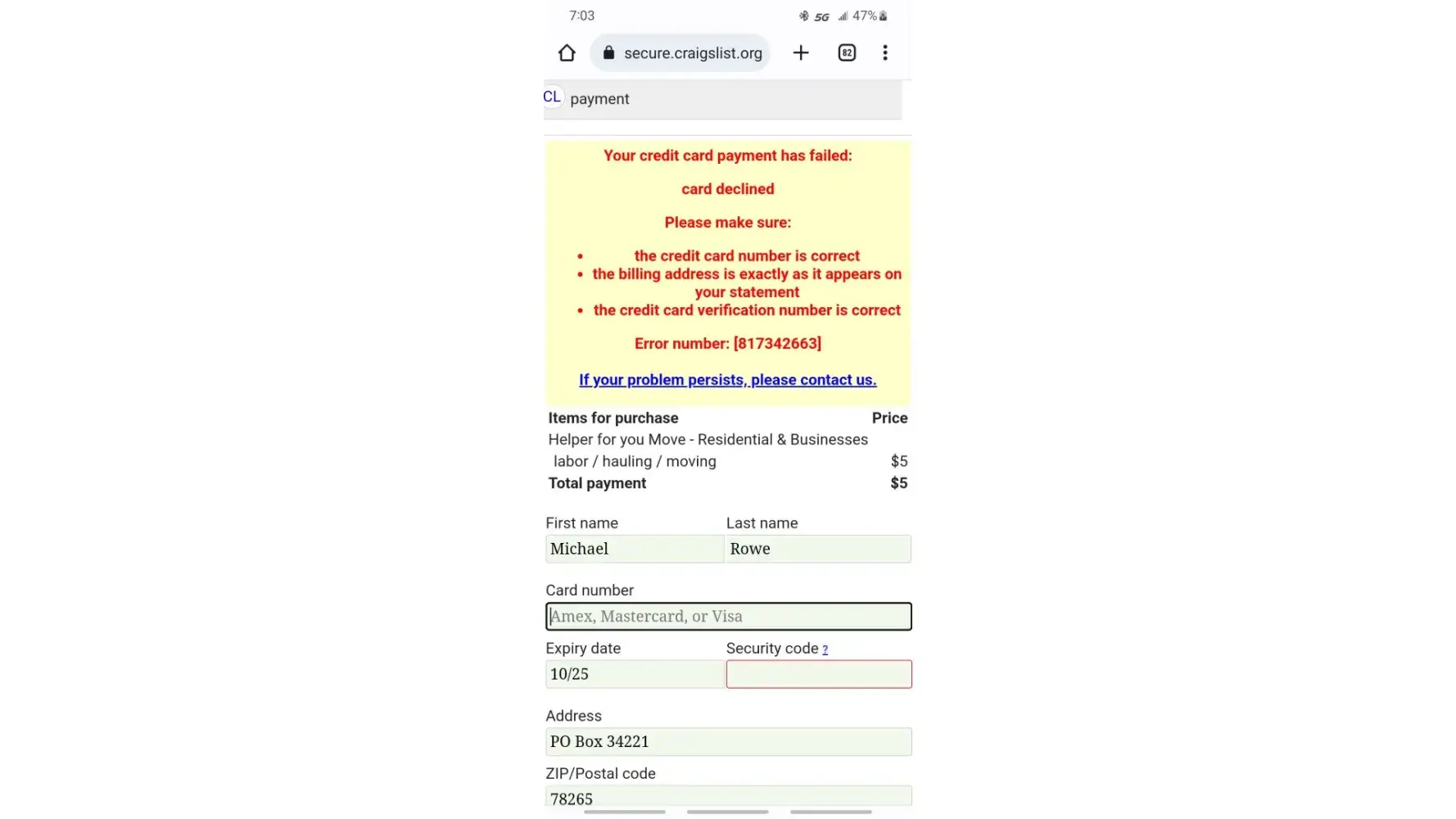 When trying to post an ad for offer help people with moving service for a job the ad keeps getting declined in there system and in the past have done plenty of jobs on craigslist with the exact same ad. I been moving local and long distance mover for both residential and businesses and all my customers very satisfied. Now when I try to post with the same credit card always use, the card is automatically declined. We need work to survive and this is not right.