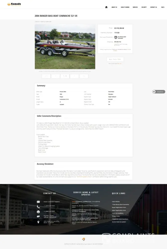 Scam, On or about the 13th of April I was shopping for a small fishing boat, looking on ebay, crageslist and boat trader, I had found one that I liked and though I could afford on crageslist boats. I contacted the owner of the boat thru the crageslist channels by email. if was just a day or so before I received an email from the owner with regard the boat for sale she had told me that the boat was being sold by a consignment company called Komodo Marina Depot. They have you fill out a form basic information you make an offer on the item you are interested and then Komodo, contacts the owner for approval of the sale price. And make the arrangements for sale, they ask for a wire transfer for the total amount 10, 300.00 and according to the site the item would ship in 2 to 3 business days. I have researched to Komodo Marina Depot, and found five or six web sites and loads of Reviews stating they have a 4 3/4 rating out of five. I was contacted by a sales rep who walk you thru the process for payment, and shipping arrangements of the item. After payment was sent, I have waited 3 or 4 days to hear from the shipper. I was unable to contact any one at their office, by telephone when to voice mail and no email response. Komodo Marina has pulled all online websites and left no way to contact them, still no boat