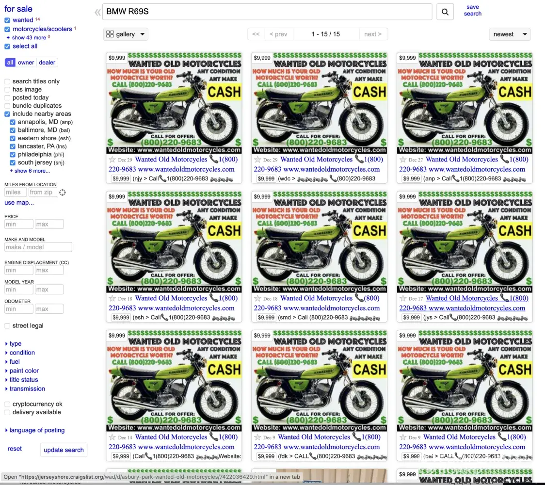 Why is this guy allowed to fill a page with the same "Motorcycles Wanted" ad in multiple states? If I want to look for a specific motorcycle, I have to plow through this guys ads. EVERY. SINGLE. TIME. Yes, I know I can uncheck the "dealer" button, but that will eliminate many motorcycles from my search. This guy does this EVERY DAY. If 100 people did this nationwide, it would be impossible to use CL. Can something be done about this abuse?