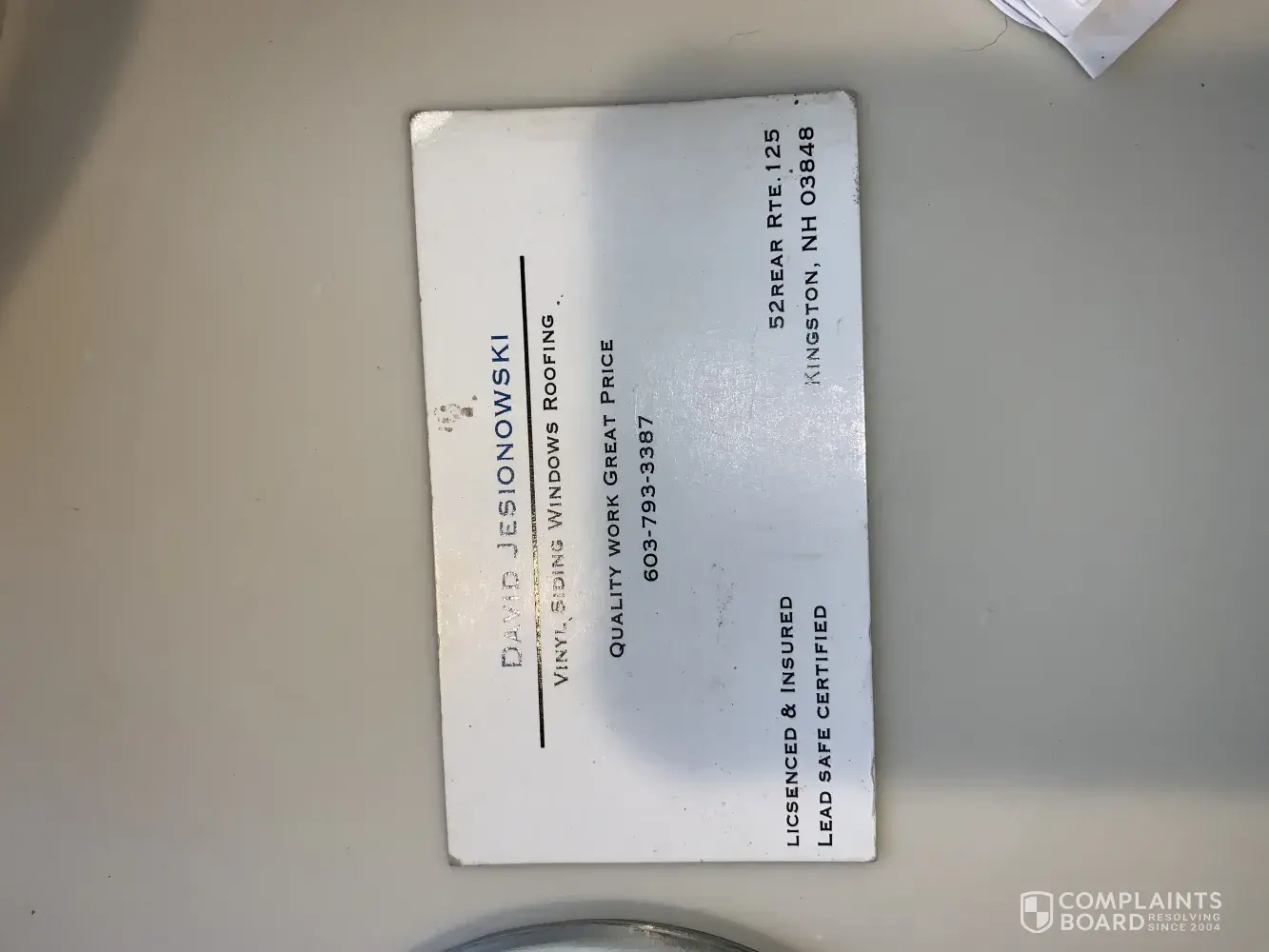 I purchased vinyl siding installation from David Jesionowski, 52 Route 125 Kingston, NH, [protected], who advertises his services on Craigslist. He left a barrel of his garbage on my property, didn't finish the gutter downspout and faucets, and re-attached the wires to my house with a nail and a piece of scrap vinyl siding; the nail blew off after a day, leaving dangerous dangling wires hanging from my house.