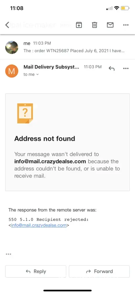 info@mail.crazydealse.com because I had not received the ice maker. I got an instant e-mail failure notice stating unable to deliver to the e-mail address info@mail.crazydealse.com.