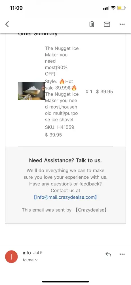 I ordered this nugget ice maker on July 7 for $39.95 from an ad on yahoo, after carefully reading the description, examining the photos posted on their website, etc. It looked a bit sketchy but since they took Paypal and I used a credit card with purchase protection, I decided to go for it and see if was actually legit. I should have googled reviews first! Well ... a few weeks later I received a cheap ice scoop. At first I couldn't figure out where it came from, as the return address did not list crazydealse or anything like it. Then my husband googled reviews for this company and came across MANY bad reviews for this exact same ice maker purchase; most customers received the cheap ice scoop. I emailed the company but also filed a claim with Paypal. Paypal refunded my purchase pretty quickly, and the next day I got a reply from the company asking me to please cancel my claim with Paypal (um, too late) and they would like to offer me $15.00 refund and were so sorry I was unhappy with my "purchase." *eye roll* Ridiculous. Total scam company - don't buy from them!