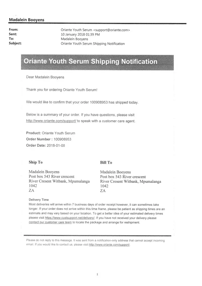 Good day On the 8 January 2018 I ordered a free trail serum with postage of R 53.00 Ordernr.[protected] This order was illegally done twice as also order nr [protected].wqas confirmed with mail received from [protected]@oriante.com The company then deducted 4 illegal amount from my Credit account 24/01/2018 -R1 230.72 under the name Infodesk 32 Crofts Park...