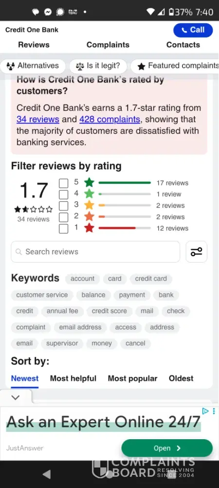Credit One Bank has a 2.8-star rating from 39 customer reviews, reflecting mixed experiences where some customers were satisfied while others were not.