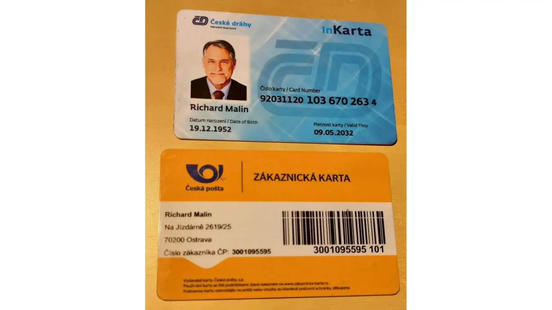 My DOB is on my Rail pass and my current address in Ostrava is on the Postal Address ID card.