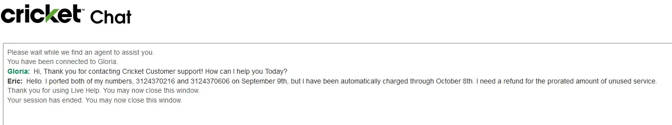 I ported out my numbers from cricket wireless to verizon on the first day of a new billing cycle and cricket refuses to refund the unused service charges. When I contacted cricket via electronic chat to resolve this dispute their customer service rep terminated the conversation without any response to my complaint... They hung up on me!