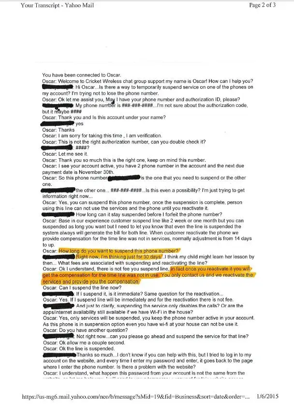Fast forward to 12/28/14, which is the date that I reactivated my daughter's line (38 days later). When my bill came up for the next month's service, I noticed that I had not received a credit, so I called in on 01/02/15. The representative told me that Cricket policy is to only reimburse for 14 days of inactive service, or $25. I told her that was not what Oscar told me, and I quoted from the transcript that I received on the day I suspended the service. I ended up speaking to their supervisor, who gave me the same spiel, issued the $25 credit, but said that she had started an escalation where they would investigate what happened on my chat conversation (they would not take my word for it, and they would not allow me to email the transcript to them). She said to call back in 48 hours for an update.