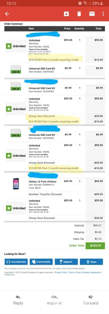 April 20th: I bought a phone and shipped it accidentally to the wrong address. The website didn't let me fix the address online, so within five minutes of making the purchase, I called Cricket to fix it. I was told that they couldn't fix my shipping address there or cancel my order (already very surprising, but okay, I'll give them the benefit of the doubt, and the woman, Patty, I spoke to was very nice). Patty said she was, and I'm quoting her, "100% certain" my order would be canceled.