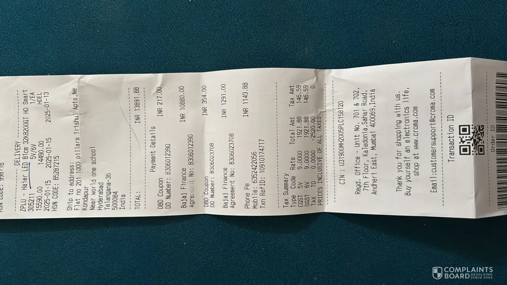 Hi Guys, I bought a new Sony LED 40 inchTV from Croma Store a month back but till now i dont have the orginal invoice. The day i purchased they said it will be sent to my home through post. After 15 days when i never received it. I called up the customer care and they said the orginal can be collected only from the dept. When i had been again they said it will be sent to my postal address. But so far no news . And the duplicate invoice looks so fake. Seems like Croma is evading from the Tax Dept not providing invoice to their customers.