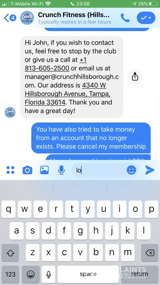 Hi. I would like an email address to complain to someone at your corporate location. I moved from the us to the UK in July. I contacted crunch fitness to cancel my membership. And was told that I could email the location to cancel I confirmed that I could do this via Facebook messenger I then emailed again to cancel and didn't get a reply. Crunch...