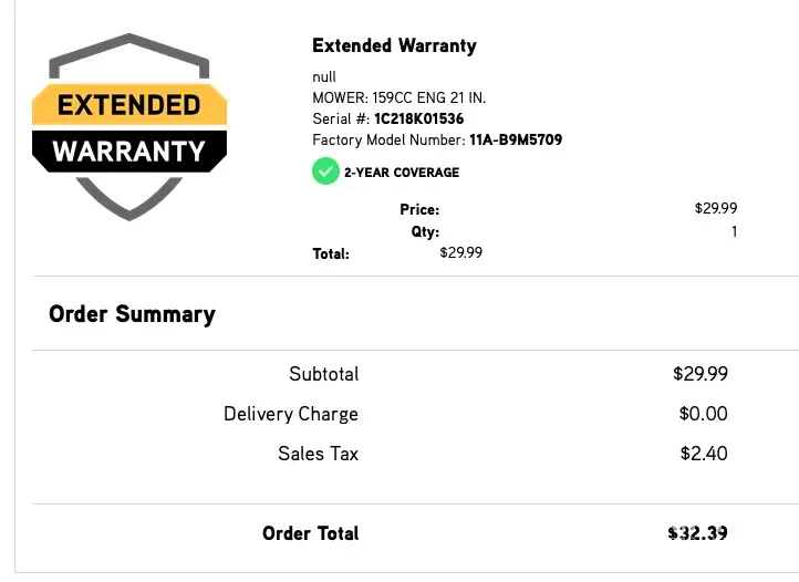 I made an online purchase of an "Extended Warranty" for this mower on 5/12/2022 for $32.39, icl. tax.