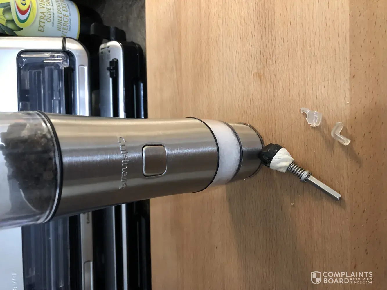 The grinder broke into pieces. The plastic piece holding the mechanism for the pepper broke in the middle of me grinding pepper resulting in the grinder part and plastic pieces to fall into my food along with a hundred peppercorns that I had to hand pick out of my dish - that was not fun...I've emailed Cuisinart customers service, but I have t heard back yet (it's been 4 days so far)