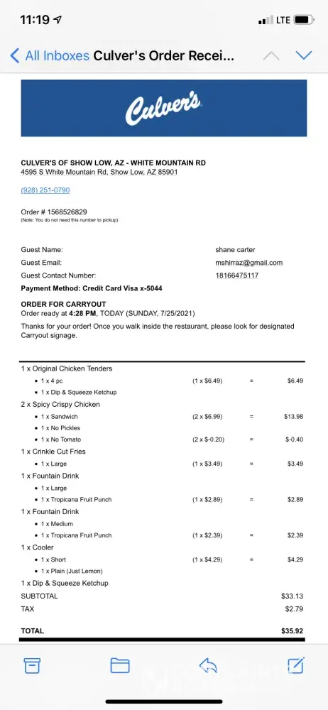 has lots of tarter. no burgers. the fish dinners were fine as I ordered. So I called Portage Culver's in Indiana where I purchased my food. I asked for the manager she said she would help me. When I said I didn't get my burgers she said yes I have them in my hand, you can come back and get them. well I felt they made the mistake they should bring them to me. anyway she said she was going to send coupons in the mail for the burgers and some free ice cream. Have not seen or heard anything. I have in the past visited quite often but not anymore.