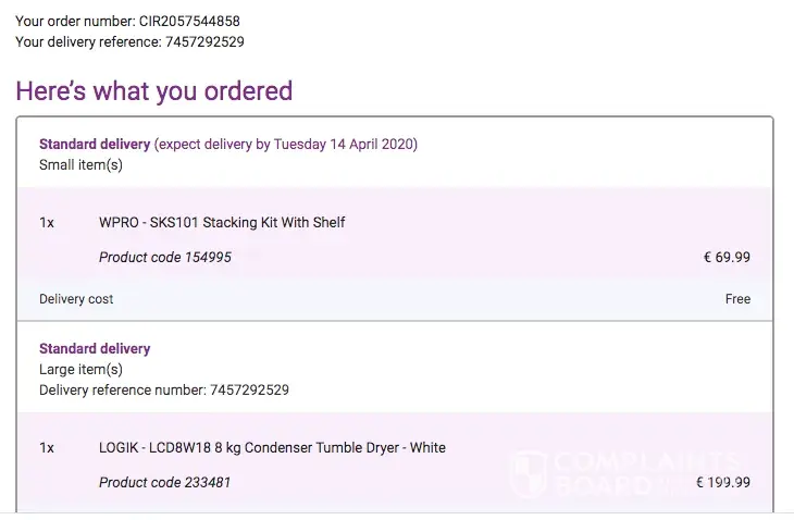 On the Saturday I get a call from the driver saying where am I? Turns out the customer service agent who took the order fat-fingered and put postcode down as AE rather than EA, and Road rather than Lane. Got told to ring customer services to rearrange delivery.