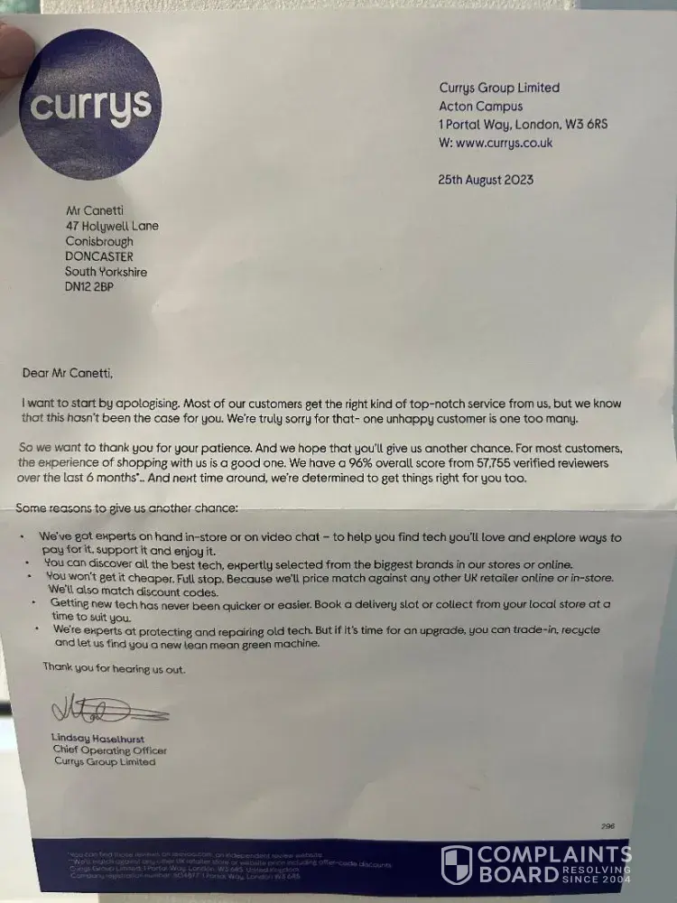 I have all so attached the sorry letter from Curry's in response to my complaint letter.
