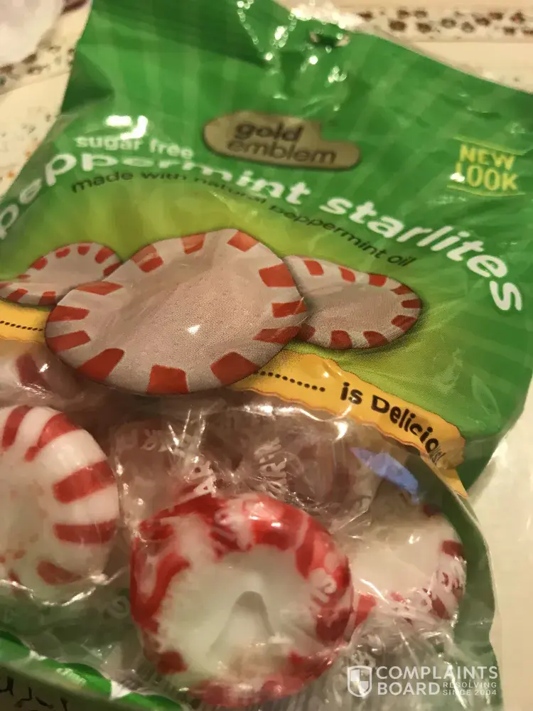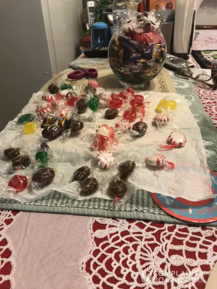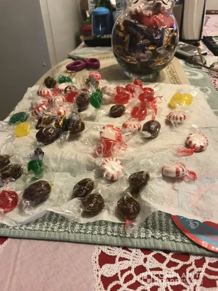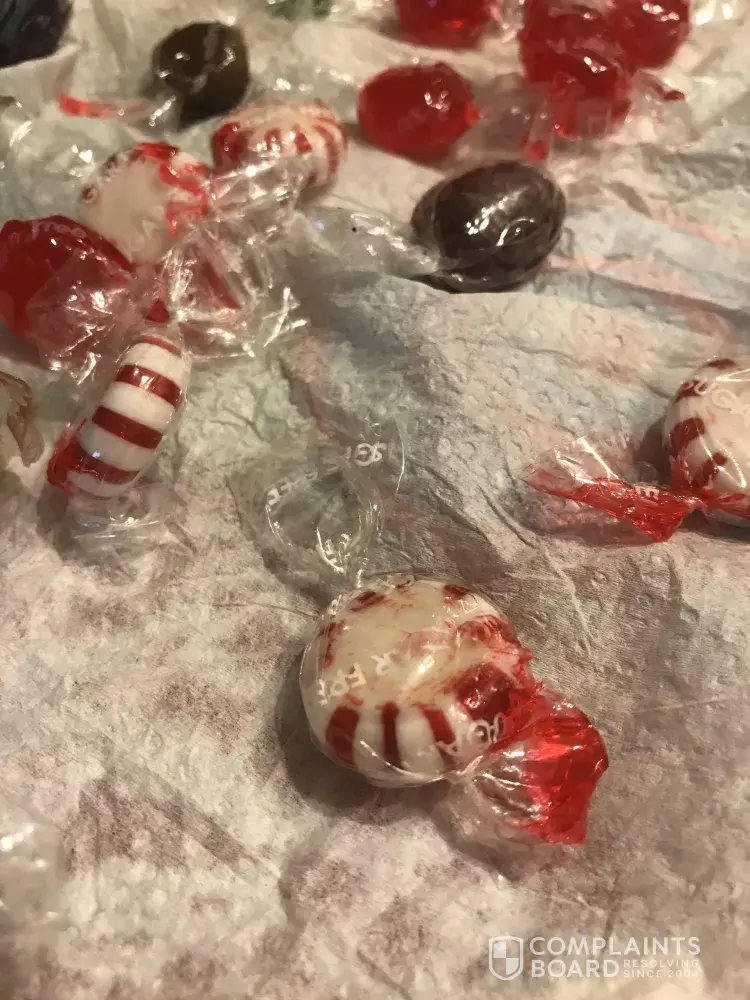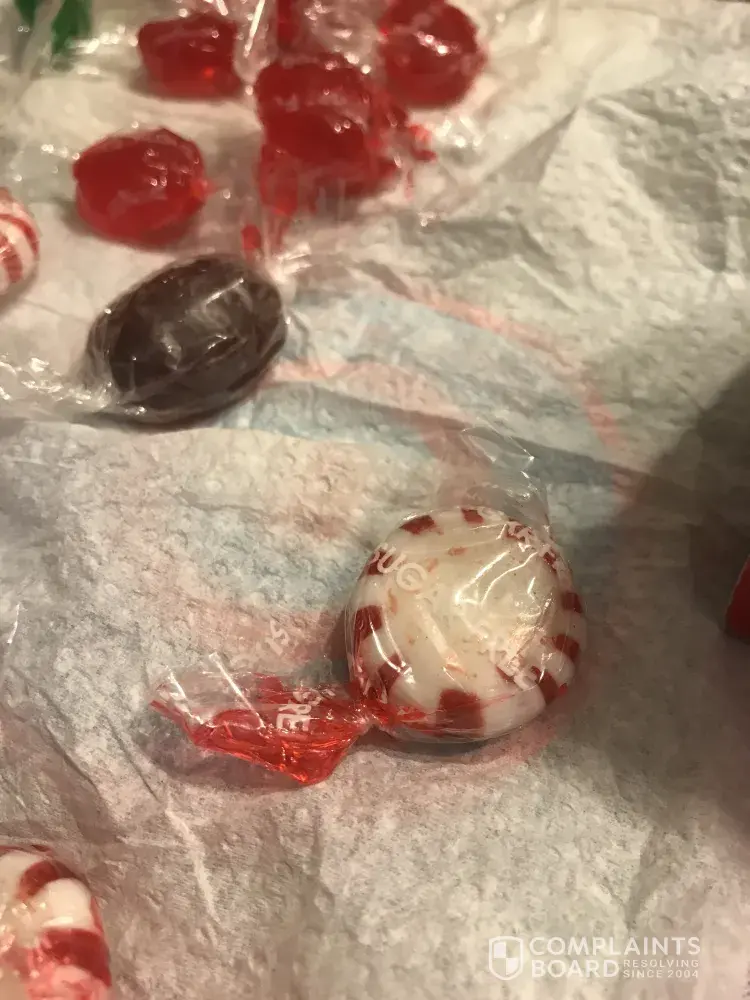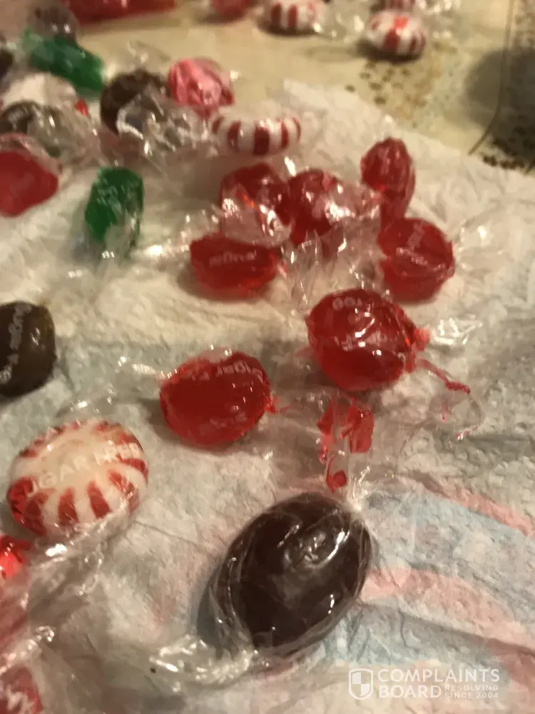 We purchased several bags of cinnamon cherry peppermint and root barrels and they are melted and in her candy dish. I have photos. My mom is elderly and can't remove the wrappers. I am attaching photos. Some are melted in the bags. I'm not sure if this is old or if there is a problem with CVS Gold Emblem Sugar free candy. Mom has mentioned several times that she can't remove the wrappers. Has anyone else had this problem?