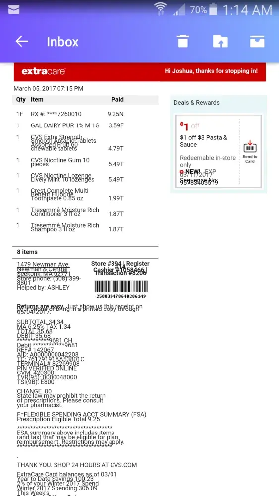I was in the Newman Ave Seekonk MA location tonight, I went to the the pharmacy to purchase my items and pick up my prescription. My total came to $35 and I let the cashier (Ashley 1058466) scan my CVS card, which I had a 20% off coupon sent to my card the day before. I asked her if the 20% off was there and she said no, so I proceeded to check out I didn't want to hold the people behind me up. As I was walking to my car I checked my CVS app to verify the 20% was on my card, which it was. So I went back in to simply see if there was any way I could get the 20% honored, Ashley proceeded to tell me "I already told you it wasn't on your card, but I will call a manager" at this point I could tell she was a bit annoyed that I was interrupting whatever she was previously doing and seemed to be a burden to her. The manager (Rafael) then approched me with the remark "what do you need" I myself am a manager and i would never talk to one of my Coustomers in such manner that he did to me. I explained the situation to him and he said there was nothing he could do because it's not on my card, I at this point was more upset with the way I got treated than concerned about the 20% off so I said OK and walked out. I was very taken back by the lack of professionalism from the manager and will definitely be taking my business elsewhere.