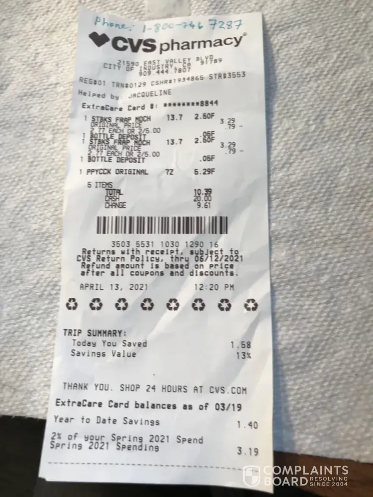 I bought products at CVS Store on El Camino Resl. I was at the end register nearest he door after 1:30 PM and the Man behind the counter ask for my Card Number, which is my phone number 650 573-8277z. The charge was. $ 10.12 and I used my $10.00 monthly cvs charge and he asked for $0.11 which I paid in cash. This was on Friday, 4/16/21. Now I get A charge...