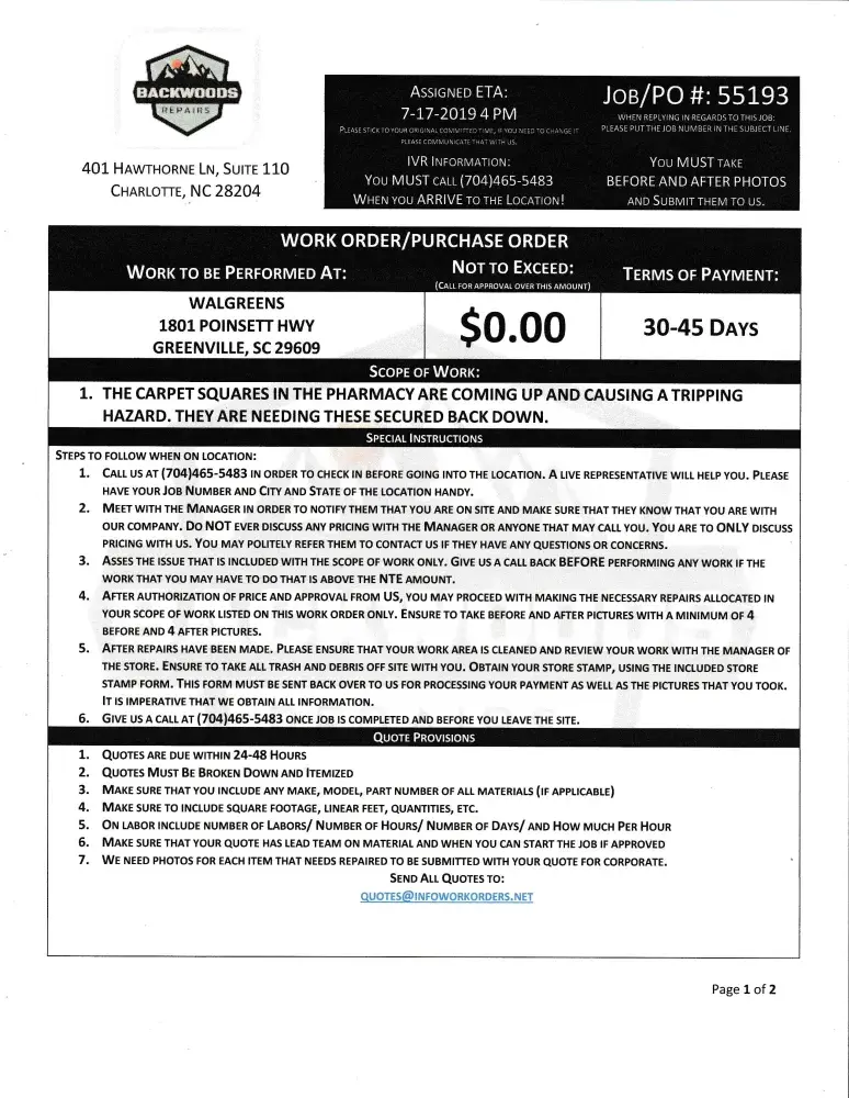 I received a call today from someone with a Florida number. She said their company name was Backwoods Repairs. Then asked if I could take care of a service call at a nearby Walgreen's. She mention it usually took up to 60 days to get paid. But because I was a new vendor and responding so quickly they could make it 30-45 days. Something wasn't sitting right...