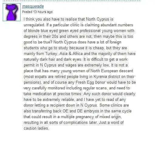 Back in 2015 (see image from that time posted on a forum) I tried to warn people about the underhand behaviour of this practice whilst I still lived in North Cyprus but nobody would listen to me and my post was trolled and I was banned. There is a group on Facebook called North Cyprus Rogues Scammers Con Artists exposed, that is a closed group and anyone interested to find out just how low people will go in that unregulated country should join. I was never a client of theirs, but having gone through IVF myself 19 years ago (my son is now 18), and with a background in media and investigative reporting, my discoveries re "Team Miracle" were truly astounding!