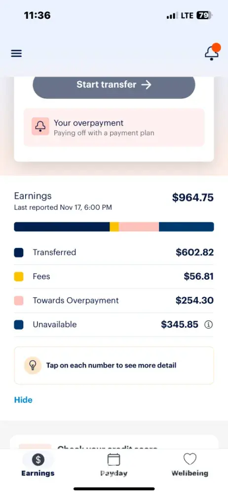 Just not a good experience at all. Come to find out that they are taking more money then what I transferred cuz I’ve been doing the math up all night doing it too for the last few weeks. Only reason I found this out was cuz a couple weeks ago I had my card that I transfer the money to locked cuz that’s what I do if my paycheck or what’s left of it isn’t there by the time I go to bed around 2am on Friday’s so that way things can’t take out when I’m sleeping so I can pay the stuff that needs to get paid over the stuff I want like Netflix an what not. So I had forgot I locked that card when I went to transfer money an since it was locked i went an unlocked it an tried again to transfer an said I had to wait 24hrs to be able to transfer money or add a new card. So I went to add my cash app card an I got a notification saying that I can’t add another card till I talk to customer support so I called was on hold for a half hour but had to get ready for work so I opted to save my spot in line with a call back took them 3 hours to call me back but I was at work an couldn’t answer my phone. So when I was able to I called back an was on hold for just a few minutes shy of an hour so had to go back to work my hour break was up yep used my whole break on hold so I opted for another call back. Finally another 2 half hours later got a call back was able to answer this time got my card situation handled so finally transferred that money then I look at my statements an says I transferred it twice. The whole statement part of daily pay doesn’t make sense either for example it said this is what you transferred from June 3rd-10th pay period but then have the transfers for June 11th in that pay period but yet I got paid x amount an I owed them x amount just didn’t make any sense but was up all night doing the math cuz I was laid off from my job as of last Friday July 1st out of no where mind you so I have no income right now an seen how much I supposedly transferred. Mind you I was adding in the 2.99 fee too when I was doing my math still didn’t add up an shouldn’t be counting that in there since that is already paid. I would just suggest not using it unless it’s like everyone says if you absolutely need too an only in small amounts. Oh not to mention I was on the phone with someone from customer support at 5am this morning for him to tell me they didn’t take the money an that when I told him the math I was doing an did over an over again wasn’t adding up for him to tell me that I’m taking to much time on the phone that he would email me the transfer statements for the pay periods an all that when I had it right in front of me plus the statements from the cards an accounts I’ve transferred money too right in front of me an her to have got the email hmm ok.