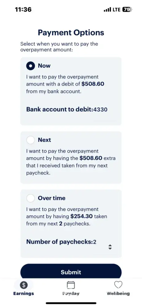 So according to the agent I talked too they overpaid approximately 500 people two weeks ago. This also conveniently happened on the same week I was supposed to be receiving my yearly bonus vacation pay so I was “expecting†extra money and was not surprised when I had extra money deposited into my account. A week later they took one of the 661 dollar payments back from me. I called and had the issue “investigated†(which it wasn’t) I was supposed to receive an email explaining what happened. So this week when I received only an 18 dollar paycheck I called to see what happened(keep in mind I had no idea this was connected to the “overpayment†which had happened the previous week like I said no one emailed me). So somehow I was paid like 1100 dollars but they are claiming they also overpaid me by 1300 dollars. Was I supposed to receive a negative paycheck? The agent just kept going back to like every transfer I had made the previous weeks which should’ve already been taking out of those weeks that I had worked but apparently I guess they weren’t? Anyways who knows I was so frustrated at the end of the call I just hung up. The lady on the phone was nice even though I was furious and still am if anyone is reading. If you’re an accountant or just really good with math then I guess this service can be ok for you. But even then like the title of this post good luck if you ever have an issue and be prepared for them to overpay you and then take money from you without ever notifying you.