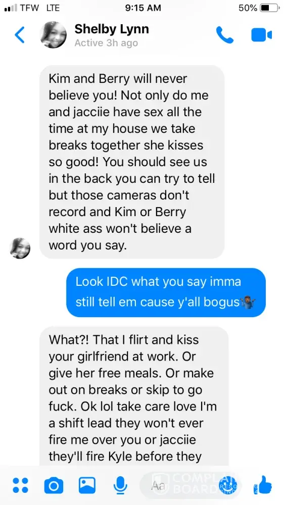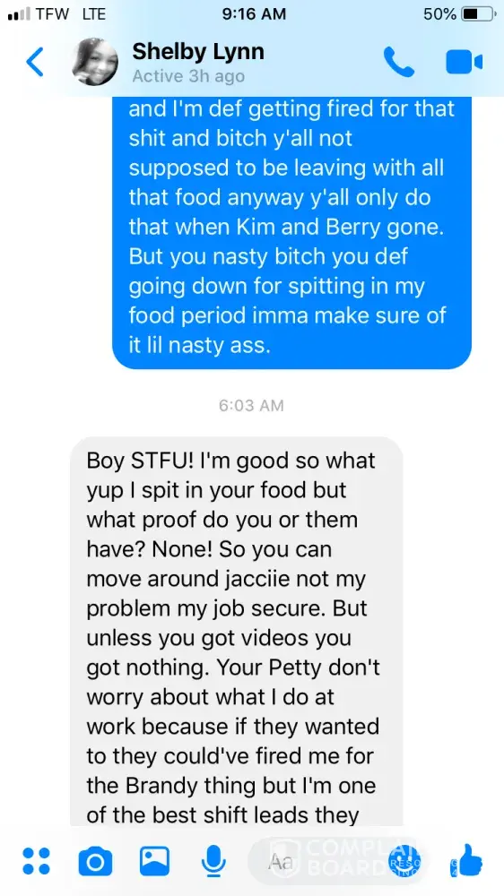An employee was having an affair at work with my girlfriend who was also an employee and once I confronted both of them later I was told by my girlfriend that she hoped I enjoyed my spit burger. I then confronted her Co worker/lover or whatever via messenger and she admitted everything. I contacted the boss and the unsanitary act was disregarded and he said...