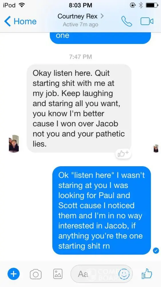 At about 7:40 PM 6/19/2017. I went to dairy queen with my cousin to get ice cream through the drive through we were laughing and I was pointing out some of the employees I know, I get my ice cream and I left. at 7:47 PM I've received a text on Facebook messenger from Courtney Rex an employee who served me in the drive through. the text states "Okay listen here. Quit starting [censor] with me at my job. Keep laughing and staring all you want, you know i'm better cause I won over Jacob (her boyfriend who is also an employee at Dairy Queen) not you and your pathetic lies" I responded to her explaining that I was not staring at her I was looking for some of the employees I know and that I was not interested in her boyfriend. I'd like for her to be fired, according to some of my friends she has done this in the past with them before. Because of this threat it makes me not want to go to this establishment anymore and I am a loyal customer i've been going to this establishment about once or twice a week treating the employees with respect and even joking around with some of them.