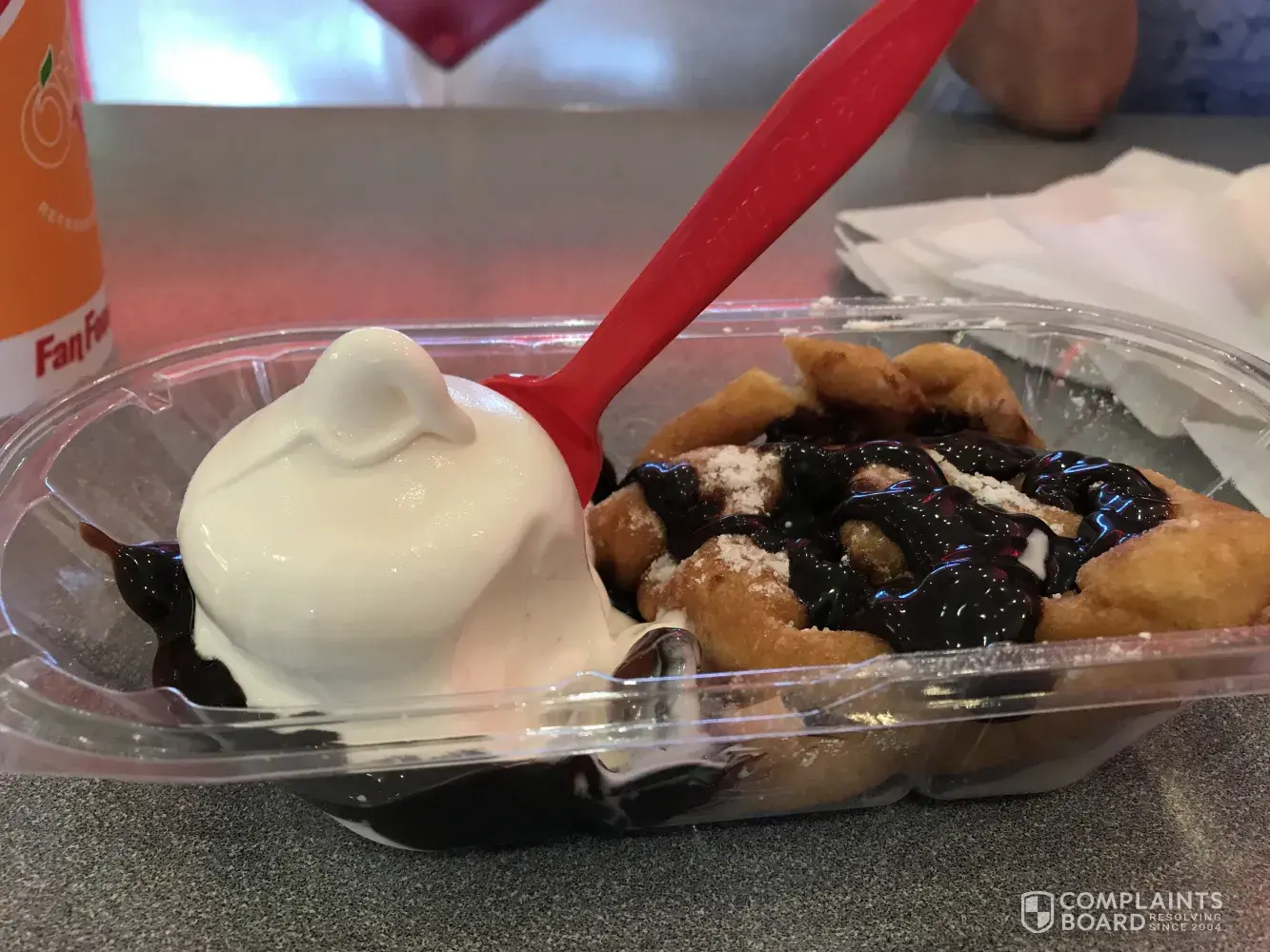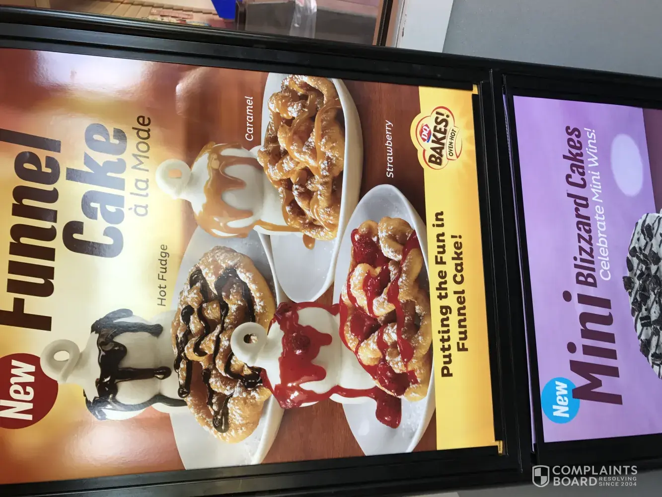 Saw the advertisement on slim gear into he restaurant. After my family and I ate our burgers n frys, we ordered the funnel cake hot fudge. Boy it was not a gen close to me he picture, brought it back to he from counter and they were happy to make me another one. Well, the second one was even worse then the he first. I do have pictures of both if u send me a email I can send it hem too.
