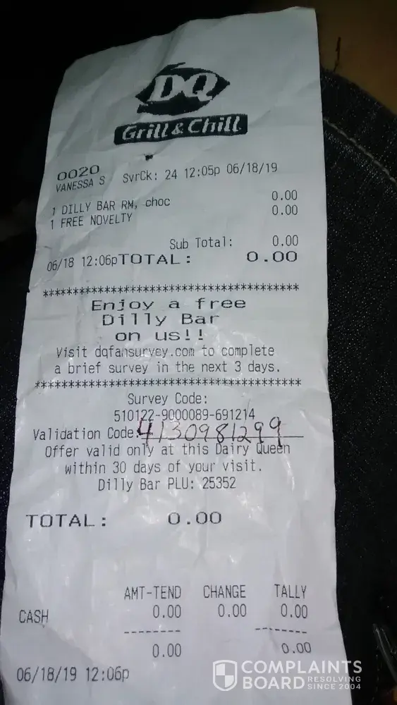 No sign stating not excepting free dilly bar with survey code . After waiting in the drive-thru for over 10 minutes a manager Crystal and a employee Julia said they don't except survey there on 3210 West Broadway Street Council Bluffs, IA 51501. Why do the have a Diary Queen logo if their not a true company who is representing Diary Queens. ...contact Diann [protected]