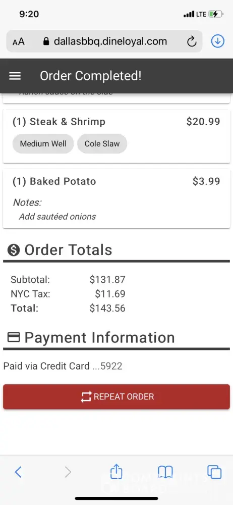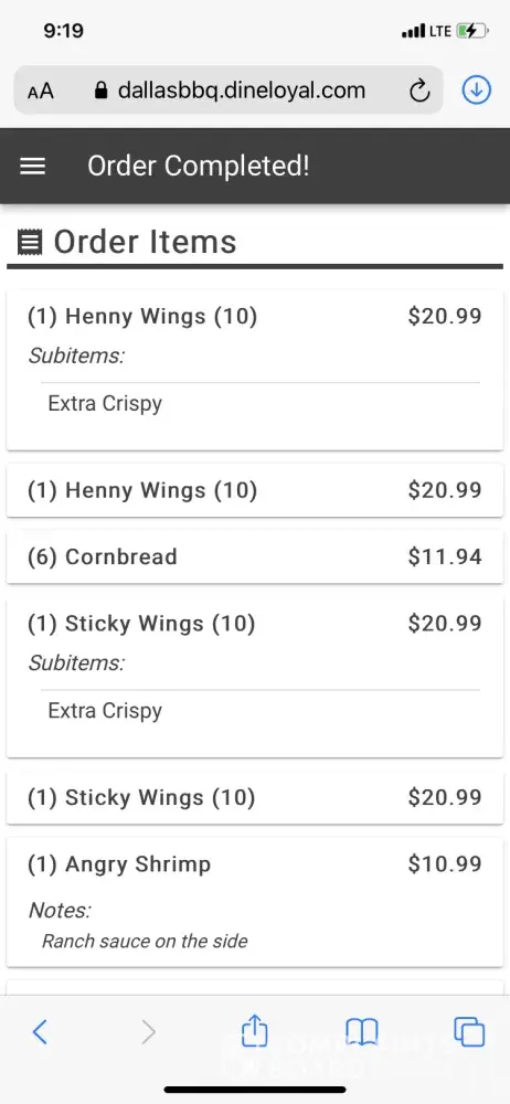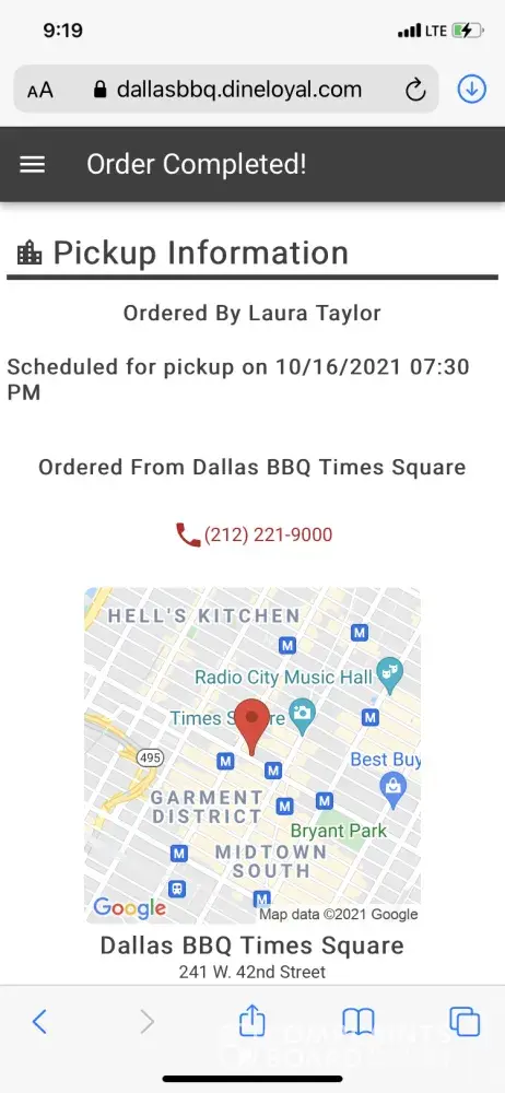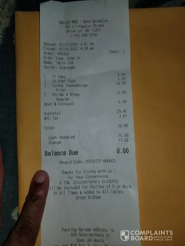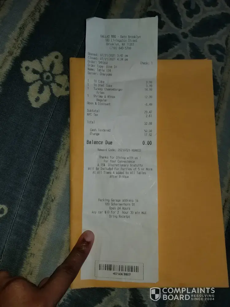 My friend and I arrived at Dallas BBQ - Times Square (located at 241 W. 42nd Street between 7th and 8th Avenue) at approximately 10pm on Thursday, November 11th 2021 after leaving a play at the Golden Theatre. An employee, who was at the take out window, by the name of Nicolas took my order, which included two (2) five piece Texas Wings; #5 Special Baby...