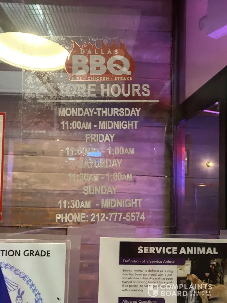 Hello on March 5th at 11:12pm my husband my 3y.o. Old daughter and myself visited Dallas bbq at 132 2nd ave in New York City where it stated ( I have pictures of the door) that the business closed at midnight. We was approached by a black slim tall waitress who told us immediately that they are closed she has to much work to do and she can not seat us. I...
