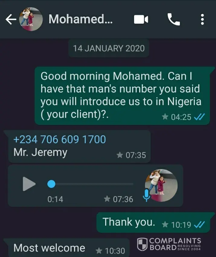 - On 20/Nov/2020 I completed the whole amount of the villa and I asked her through WhatsApp messages to follow up on the additional work requested earlier [BRBQ, Swimming pool, etc] and to prepare the cheque for our percentage 3% [attached screen shot].