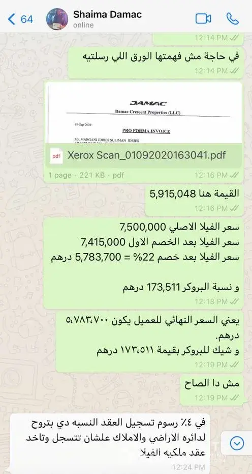 - On 4/Mar/2021 I received a call from Akram and he puts me on speaker with Ms. Shaima and Mr. Omar to resolve the case and it was a surprise for me that a broker has been assigned to the villa we bought and already took the 3% commission ! and it was the a guy who I met with Ms. Shaima the first time I went to DAMAC.