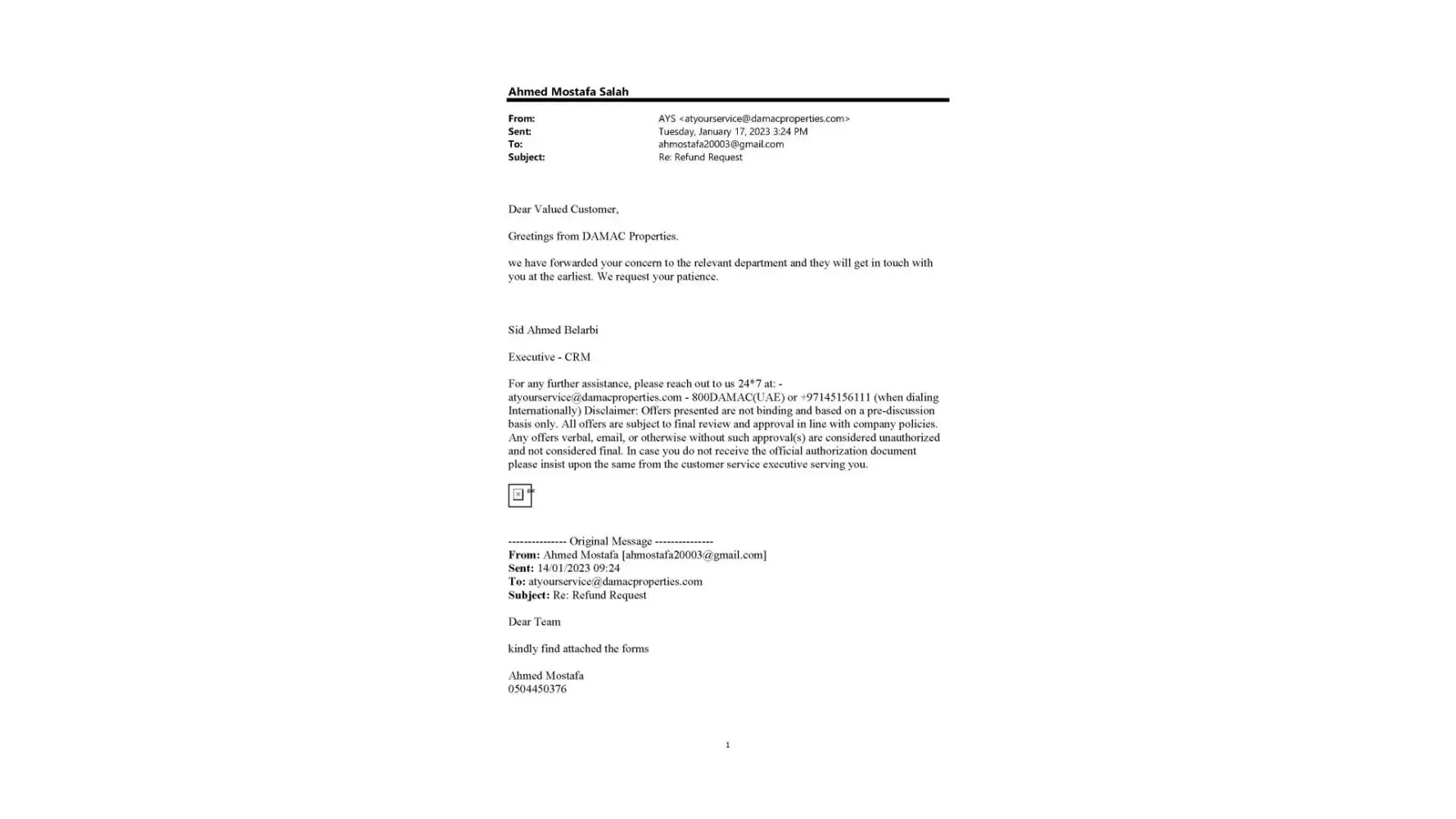At the time of purchasing the property, the agents from Damac, Mr Vineet Gambhir and Wasym Ahmed, assured to me (in writing) that I will get 2% discount from the net price, that they will refund when I pay the second installment. I have paid 3 installments so far, and still haven't received anything. They are ghosting me. I raised this with Damac unsuccessfully, so you are my last chance before I raise an official complaint with Rera and the police.