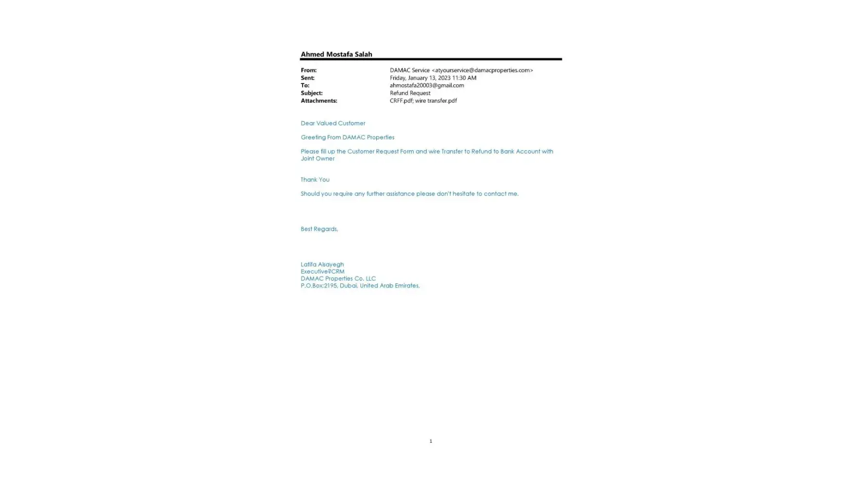 I bought a Damac off plan villa in march 2022. After having paid 20kaed for booking it Damac informed me that the unit has been already sold to another client and that my deposit will be refunded to me. I have filled the refund files and followed up the case with many reminders/calls/emails sent to damac but as of today we are in december 2022 and event after all these many calls/mails from my side still no reimbursement done...