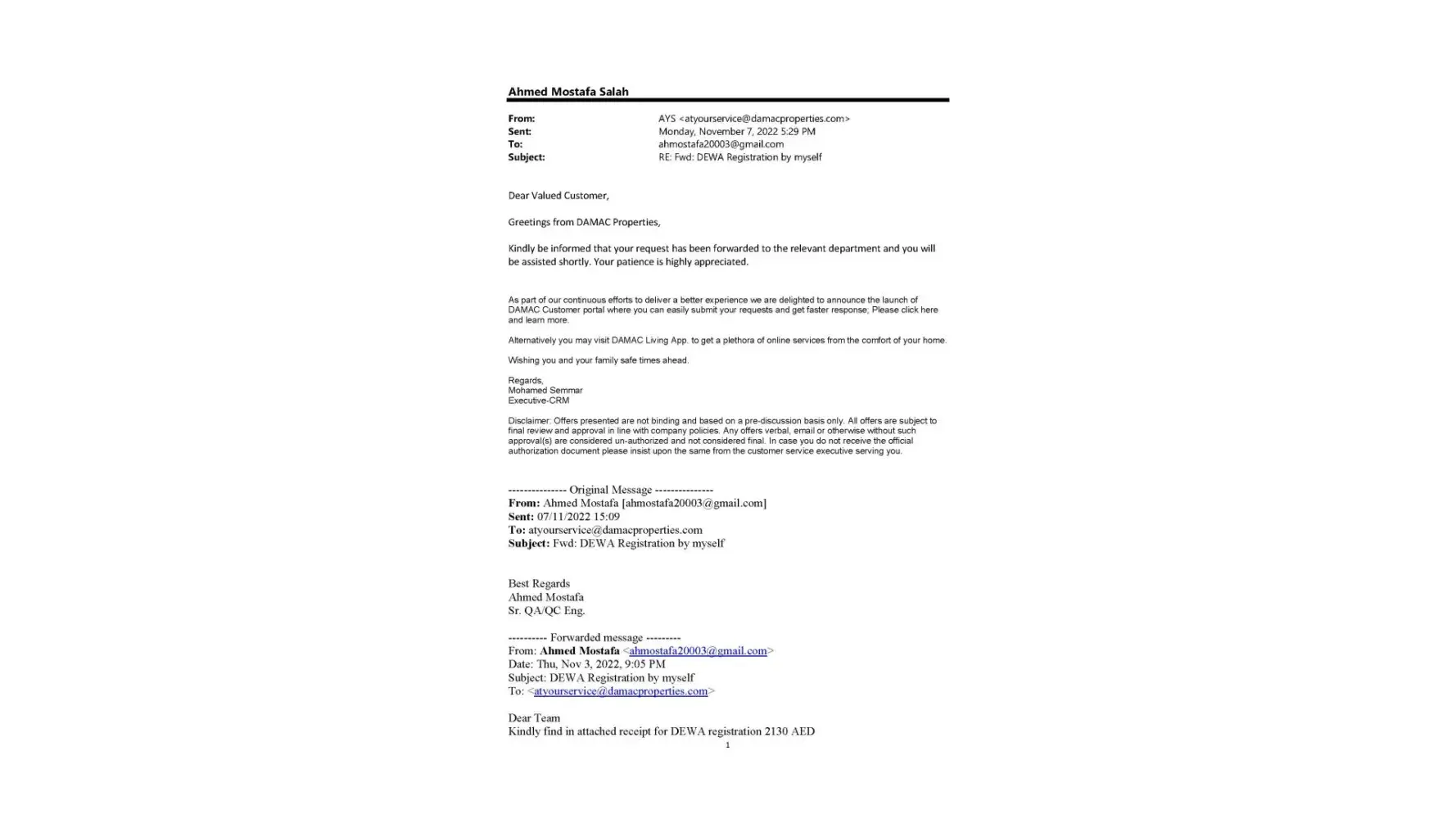 My customer number is VIRA/3/315:1059630. I have paid the security deposit along with the registration charges and additional half of the first installment on October 7th 2022. However, till today oqood certificate has not been issued. The SPA agreement between me and damac has been executed long ago.