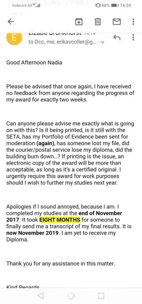 I've sent the above email to Damelin College 3 weeks ago and have done 3 follow ups, no response received to date.